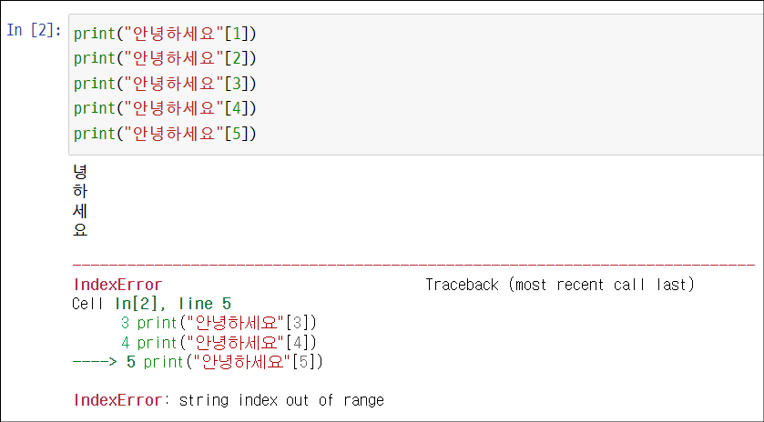 → 마지막 5행에서 오류가 발생하며, 인덱싱할 때 0부터 시작하는 규칙이나 5를 지정하여 인덱싱 범위를 넘어갔습니다.