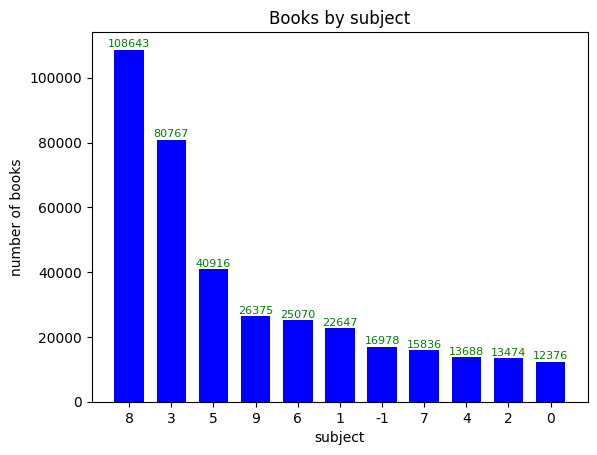 import matplotlib.pyplot as plt plt.bar(count_by_subject.index, count_by_subject.values, width=0.7, color='blue') plt.title('Books by subject') plt.xlabel('subject') plt.ylabel('number of books') for idx, val in count_by_subject.items(): plt.annotate(val, (idx, val), xytext=(0, 2), textcoords='offset points', fontsize=8, ha='center', color='green') plt.show()