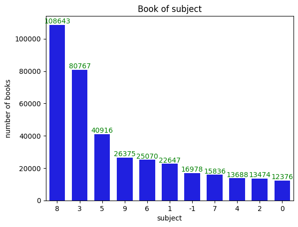 import seaborn as sns fig = sns.barplot(x=count_by_subject.index,y=count_by_subject.values, width=0.7, color='blue') fig.bar_label(fig.containers[0], fontsize=10, color='green'); fig.set_title('Book of subject') fig.set_xlabel('subject') fig.set_ylabel('number of books')