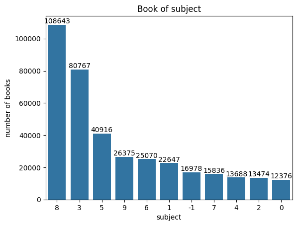 import seaborn as sns fig = sns.barplot(x=count_by_subject.index,y=count_by_subject.values) fig.bar_label(fig.containers[0], fontsize=10); fig.set_title('Book of subject') fig.set_xlabel('subject') fig.set_ylabel('number of books')